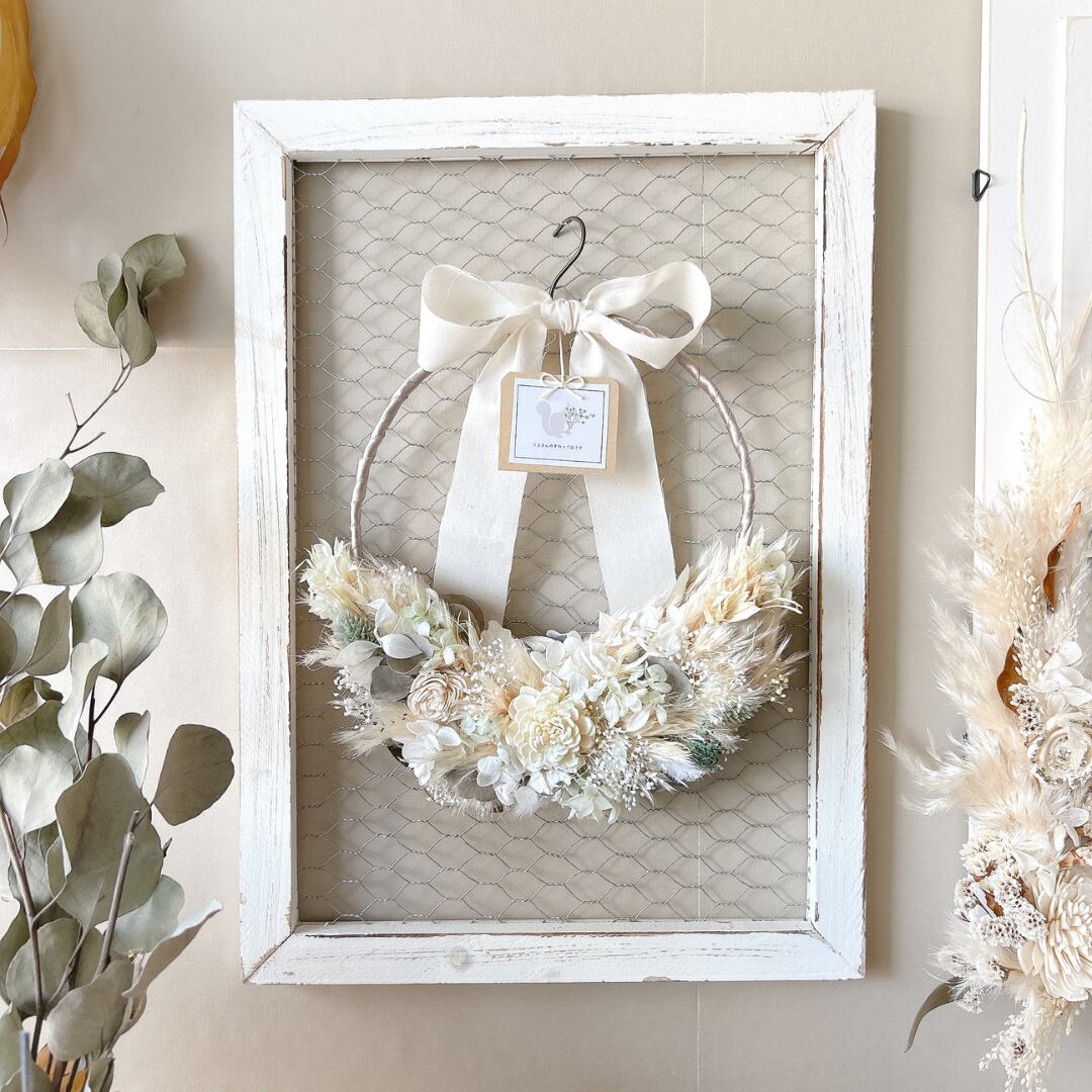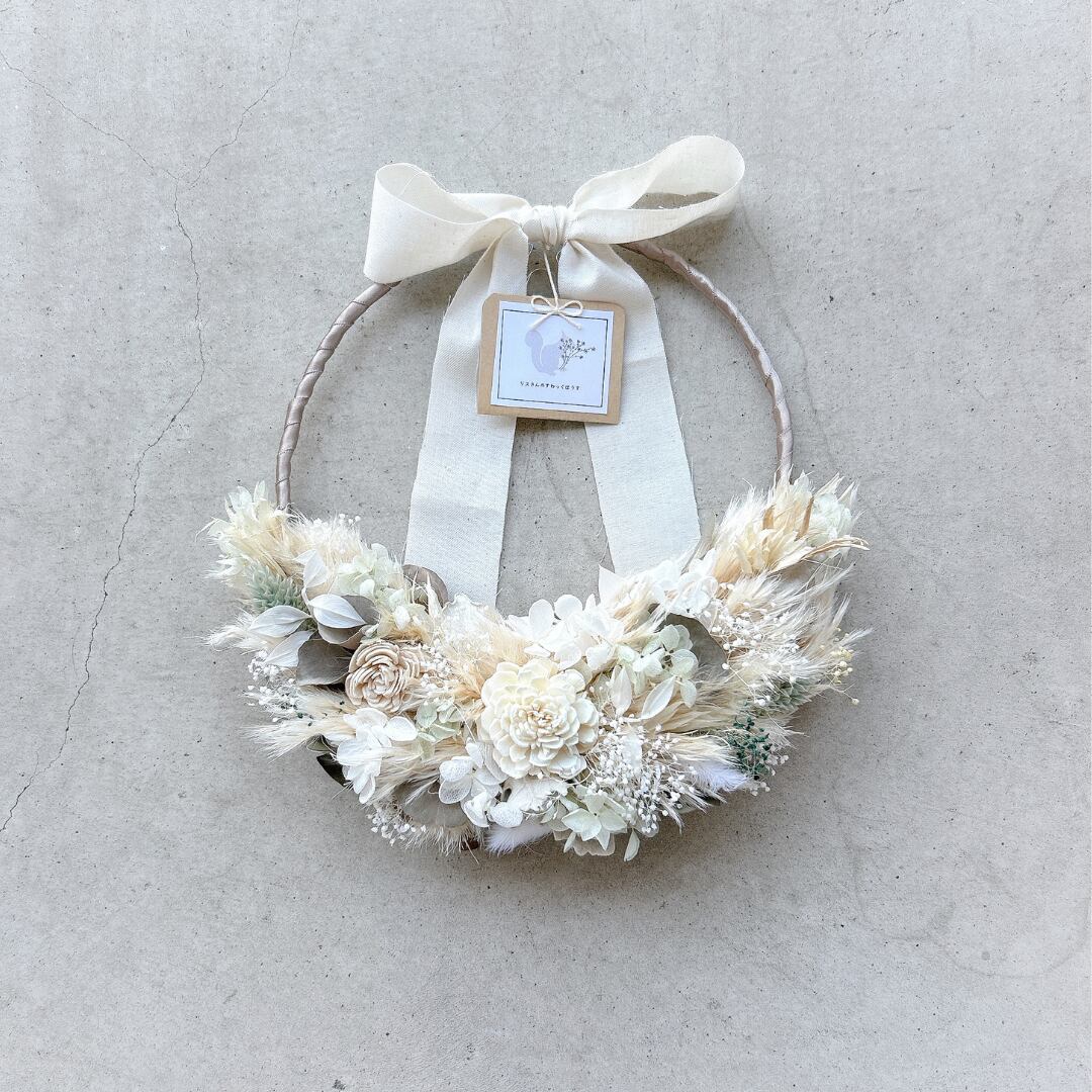 白くふわふわなドライフラワーをベースに、薄いグリーン・くすみグリーンをちりばめて束ねたリースです。